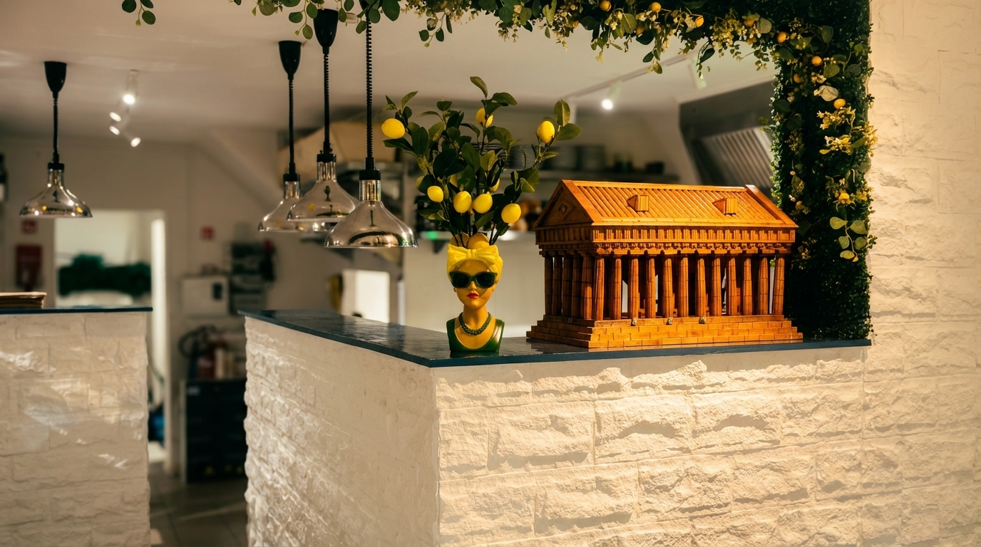 Le décor mêle baroque sicilien et élégance : Teste di Moro, céramiques de Caltagirone, citronniers, murs en pierre blanche et un four bleu orné qui est le cœur battant de notre cuisine.